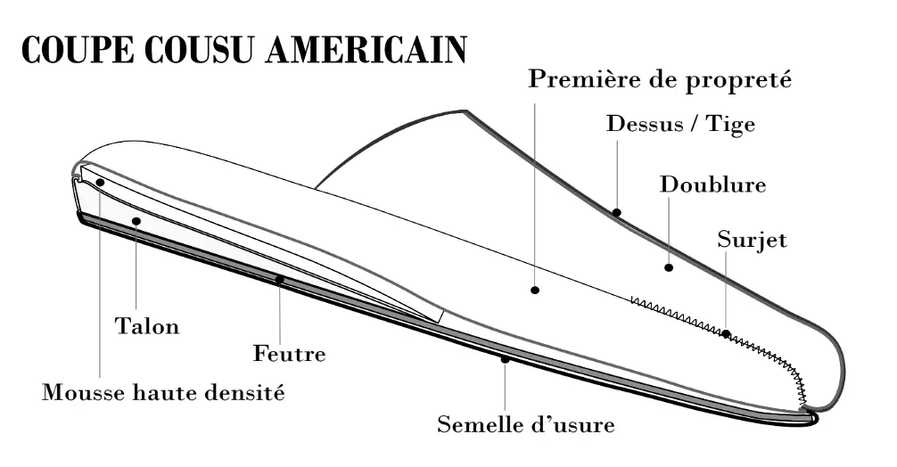 Chaque paire est montée selon un procédé spécifique travaillé sur l’envers : le montage en cousu américain. Les coutures sont invisibles.